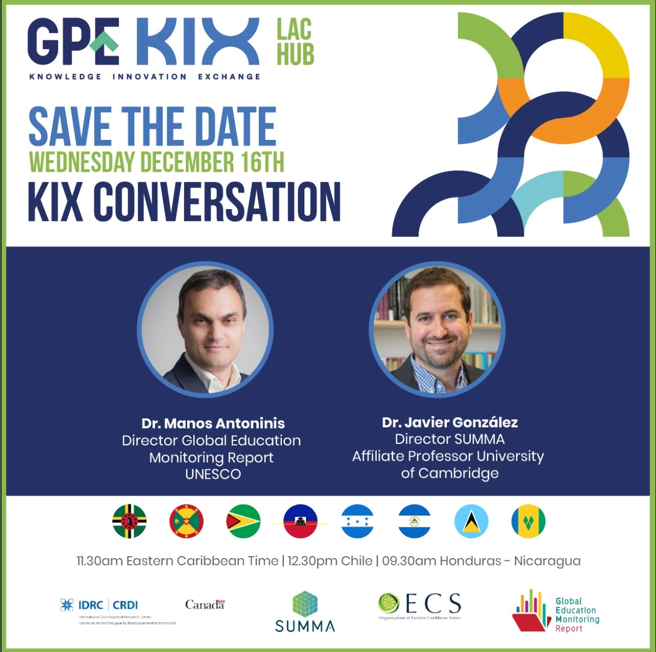 En esta ocasión, el objetivo es compartir los resultados del nuevo Informe GEM para América Latina y el Caribe. Participará el director del Global Education Monitoring Report de UNESCO, Dr. Manos Antoninis, y el director de SUMMA y profesor afiliado de la Universidad de Cambridge, Dr. Javier González.