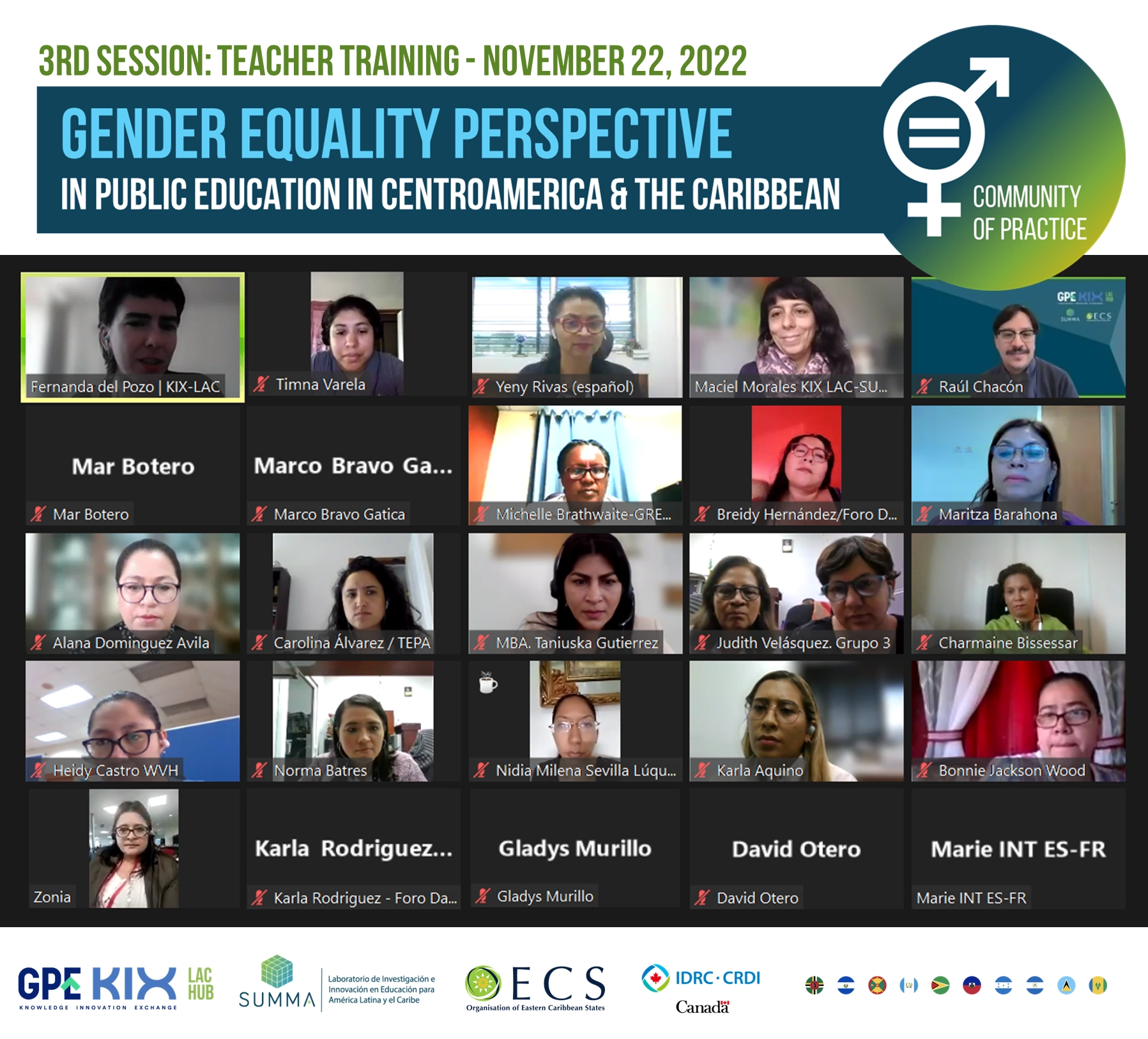 The Community of Practice on Gender and Education of KIX LAC held its third working session and webinar seminar “Educational policies for teacher training with a gender equality perspective in Latin America and the Caribbean”. This meeting, the third of 5 sessions, aimed to bring together again the members of the community and other public interested in the subject to continue working on the process of design and implementation of initiatives with a gender perspective based on experience, focusing this time on educational policies for teacher training with a gender perspective.