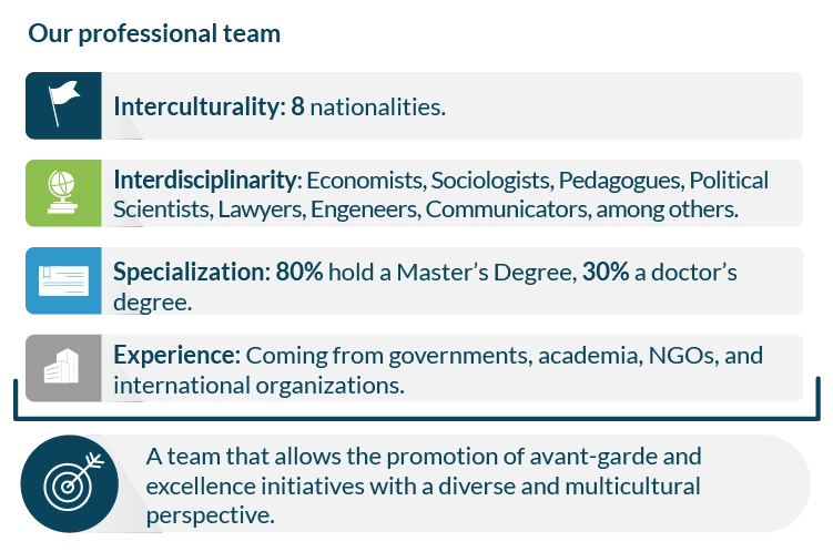Our professional team is made up of 8 nationalities. It is multidisciplinary (economists, sociologists, teachers, political scientists, lawyers, engineers, communicators, among others), highly qualified (80% have master’s degrees and approximately one third have PhDs) and experienced (from governments, academia, NGOs, and international organizations), which allows us to promote cutting-edge initiatives with a diverse and multicultural perspective.