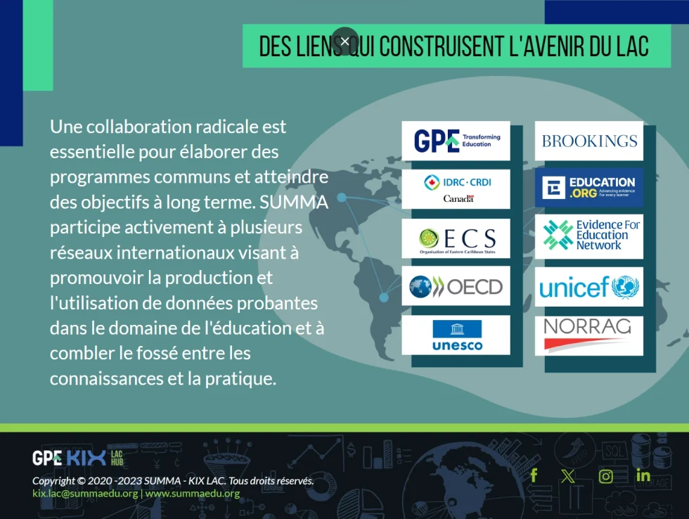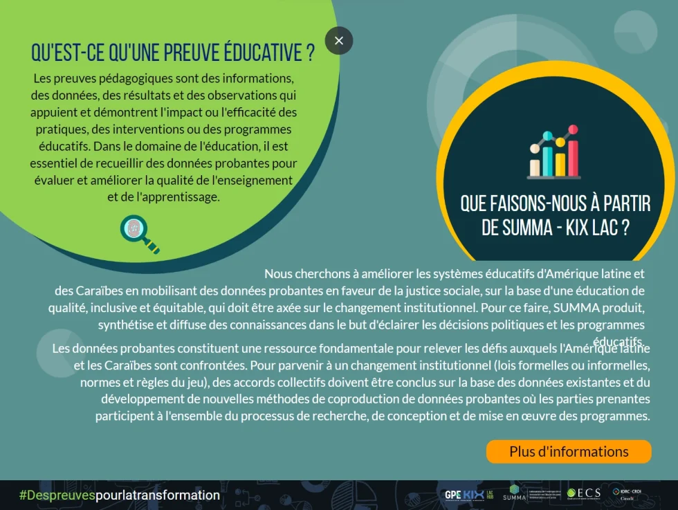 De manera transversal a las tres palancas, el proyecto impulsa la movilización de evidencia mediante la producción continua de bienes públicos regionales, orientados a apoyar la decisión educativa. Estos incluyen: