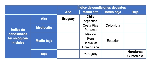 Los países fueron seleccionados con el fin de representar diversidad de contextos y respuestas a la continuidad educativa, a través de una tipología basada en dos índices que recogen variables claves para el tránsito a la educación remota: i) las condiciones tecnológicas iniciales existentes a nivel nacional y ii) las condiciones docentes previas a la irrupción del Covid-19.