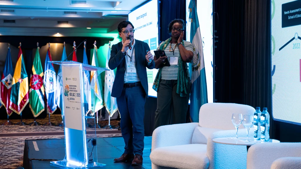 Presentación de la iniciativa de la Coalición para la Formación Inicial Docente durante el Encuentro Regional KIX LAC 2025, en Guatemala. En la imagen, Laurette Bristol, Directora de la Escuela de Educación de la Universidad de West Indies, y Raúl Chacón, Director del KIX LAC.