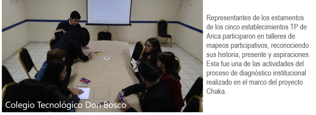 El proyecto Chaka: Puentes para el Aprendizaje Colaborativo, avanza en su implementación con el desarrollo de la fase de diagnóstico en los cinco establecimientos TP que forman parte del proyecto Chaka. El levantamiento de esta información permitirá constatar su situación inicial, visualizar sus fortalezas, debilidades y oportunidades, y consolidar información relevante para la elaboración de los planes de acompañamiento a los establecimientos durante el desarrollo del proyecto.