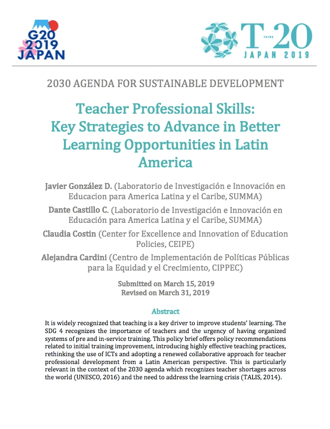 It is widely recognized that teaching is a key driver to improve students’ learning. The SDG 4 recognizes the importance of teachers and the urgency of having organized systems of pre and in-service training. This policy brief offers policy recommendations related to initial training improvement, introducing highly effective teaching practices, rethinking the use of ICTs and adopting a renewed collaborative approach for teacher professional development from a Latin American perspective.