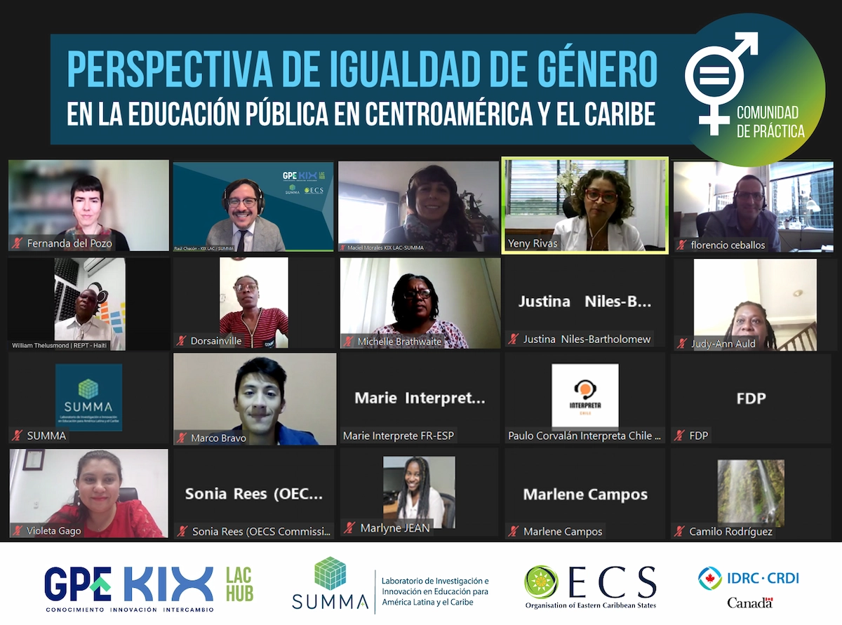Lanzamiento de la Comunidad de Práctica KIX LAC “Perspectiva de igualdad de Género en la educación pública en Centroamérica y el Caribe”, conformada por representantes del sector educativo de Dominica, Honduras, Nicaragua, El Salvador, Chile, Santa Lucía, Guyana, Granada y San Vicente y las Granadinas. Este encuentro, el primero de 5 sesiones, tuvo como objetivo reunir en primera instancia a los participantes de la comunidad para establecer la metodología de trabajo, tiempos y, principalmente, determinar los productos a desarrollar que sean herramientas útiles para brindarle a los sistemas educativos.