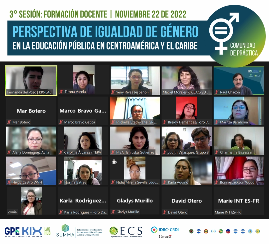 Durante la tercera sesión se profundizó acerca de la formación docente con perspectiva de género, con la participación de las expositoras: Yeny Rivas – Gerente de género del Ministerio de Educación de El Salvador; Alana Domínguez – Secretaría General de Educación de Honduras y Michelle Brathwaite – Especialista en proyectos – Ministerio de Educación de Granada.